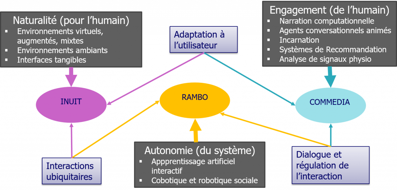 L'objectif du pôle interaction est d'apporter des connaissances et des technologies permettant de contribuer à l'amélioration des interactions entre des utilisateurs et des systèmes. Il se focalise sur la notion sensorimotrice de l'interaction en adressant des thématiques d'immersion, d'incarnation ou de couplage sensorimoteur. C'est donc un pôle pluridisciplinaire. Il est composé de trois équipes : l'équipe COMMEDIA fait des ponts entre les connaissances en psychologie et celles en informatique afin d'améliorer l'engagement que va susciter un système. L'équipe INUIT se focalise sur des solutions technologiques immersives et leur évaluation pour améliorer leur naturalité tandis que l'équipe RAMBO aborde les techniques émergentes en apprentissage automatique pour doter les systèmes interactifs de la plus grande autonomie possible.